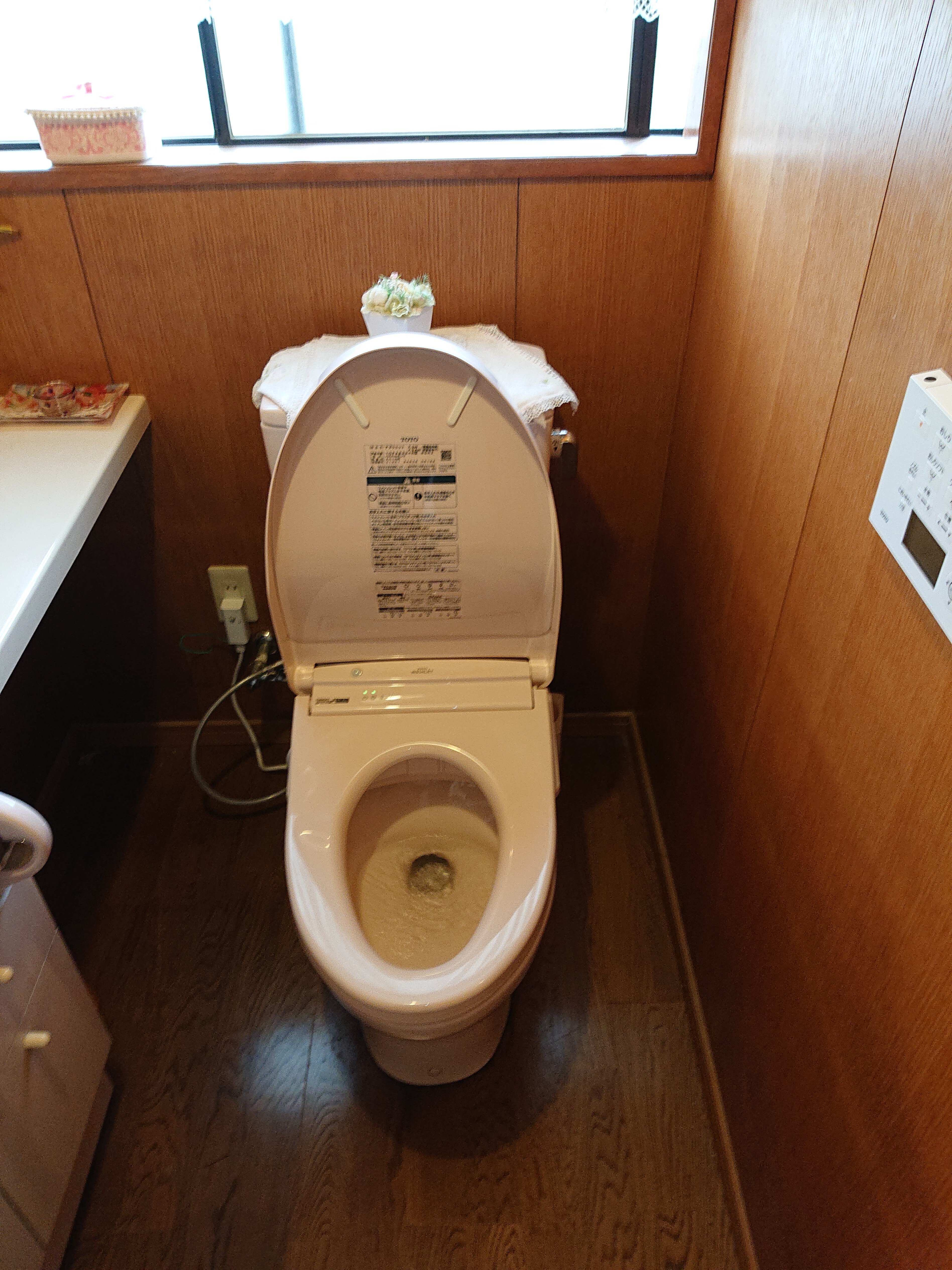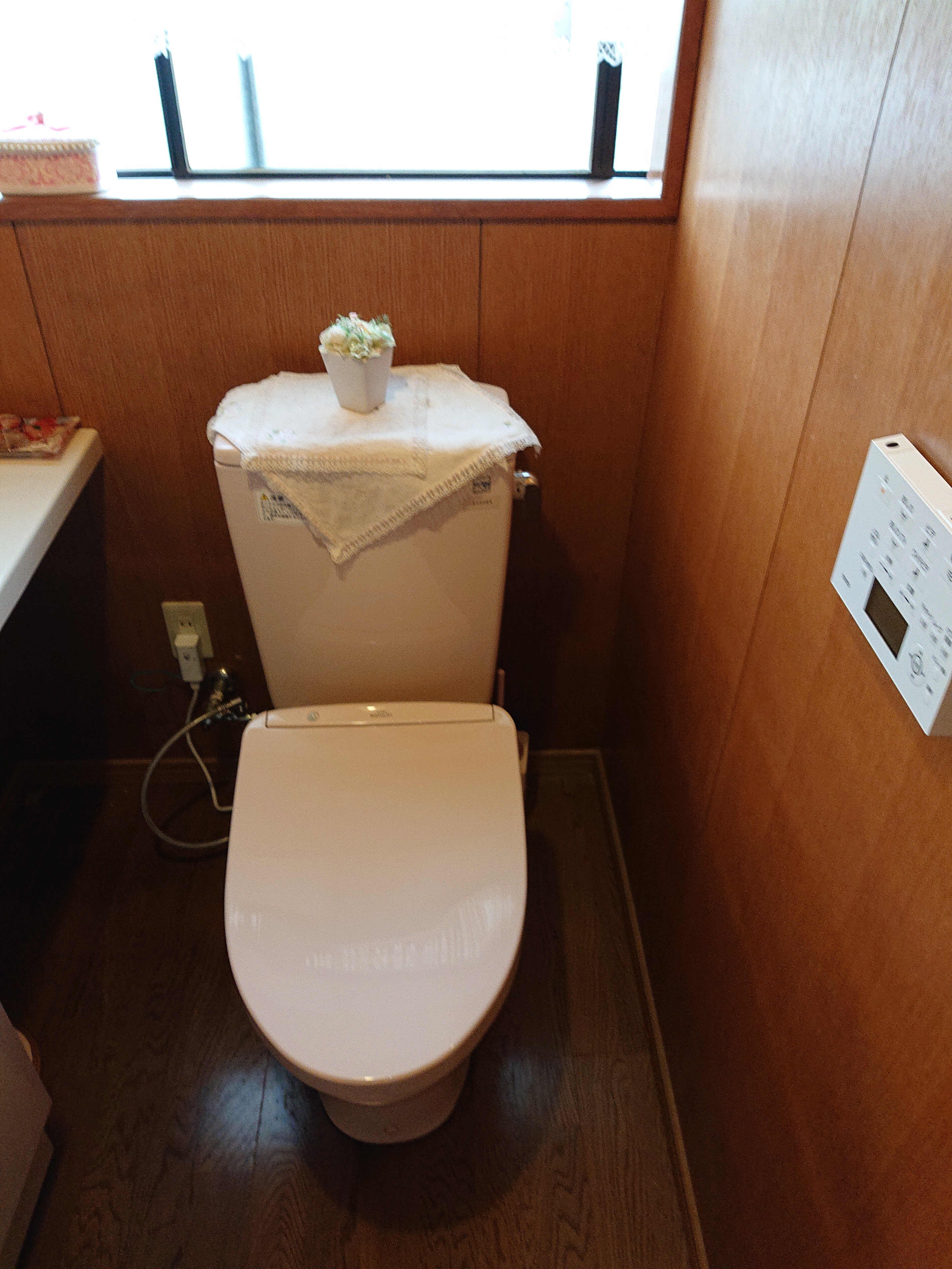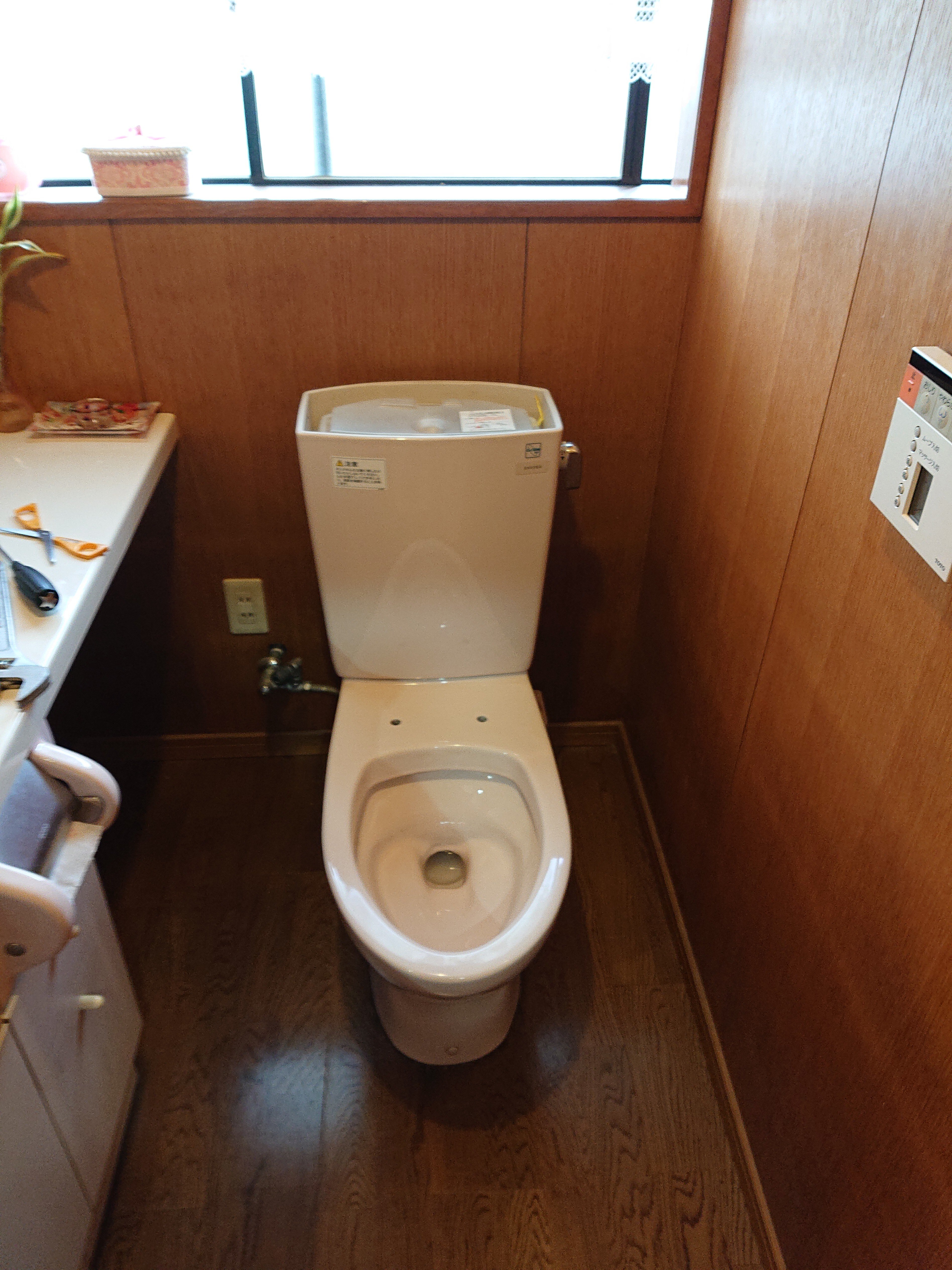 新しいウォッシュレット便座を組み込んで、給水ホースを接続して、新型のリモコン設置